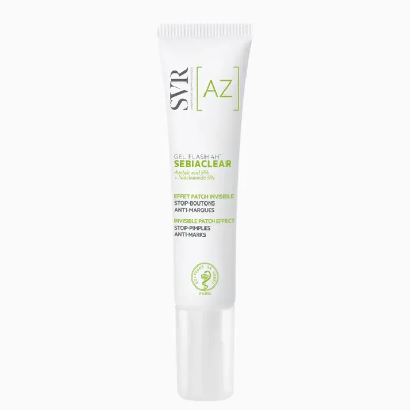 Le SVR SEBIACLEAR Gel Flash 4H est un soin ciblé sous forme de gel à effet patch invisible pour les imperfections localisées. Il est spécialement formulé pour les peaux mixtes à grasses, y compris les peaux sensibles et à tendance acnéique (acné légère à sévère). Grâce à une concentration élevée d'actifs dermatologiques, ce gel offre une action ultra-rapide, réduisant les imperfections et les rougeurs en seulement 4 heures. Sa texture gel unique crée un film occlusif invisible qui protège le bouton des agressions extérieures et du grattage, tout en prévenant l'apparition de marques post-boutons (rouges ou brunes). Son format nomade en fait l'allié idéal pour une application discrète à tout moment de la journée.