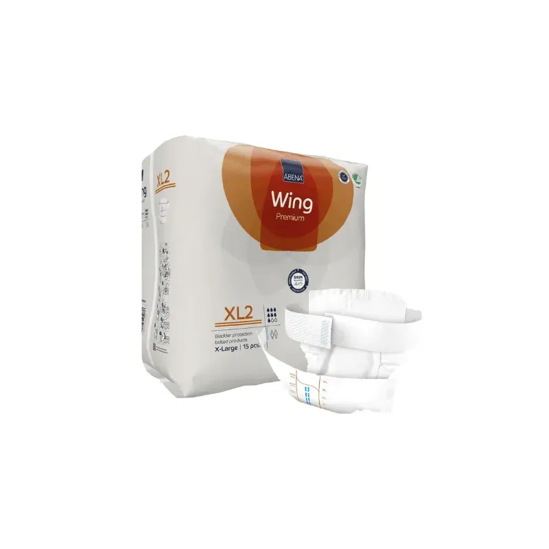 Protection ABENA WING PREMIUM XL2 (15 pièces, Taille Extra-Large), offrant une très haute absorption (Niveau 2) pour l'incontinence modérée à sévère, avec un système de ceinture pour un maintien supérieur et un confort optimal des peaux sensibles grâce à la respirabilité et au Top-Dry.