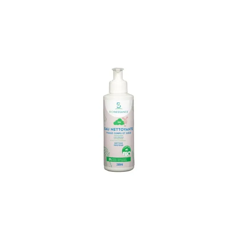 L'Eau Nettoyante Bionessance 200ml est une solution micellaire douce, sans rinçage, conçue pour l'hygiène quotidienne du bébé. Elle nettoie et rafraîchit la peau fragile du visage, du corps et du siège sans la dessécher.