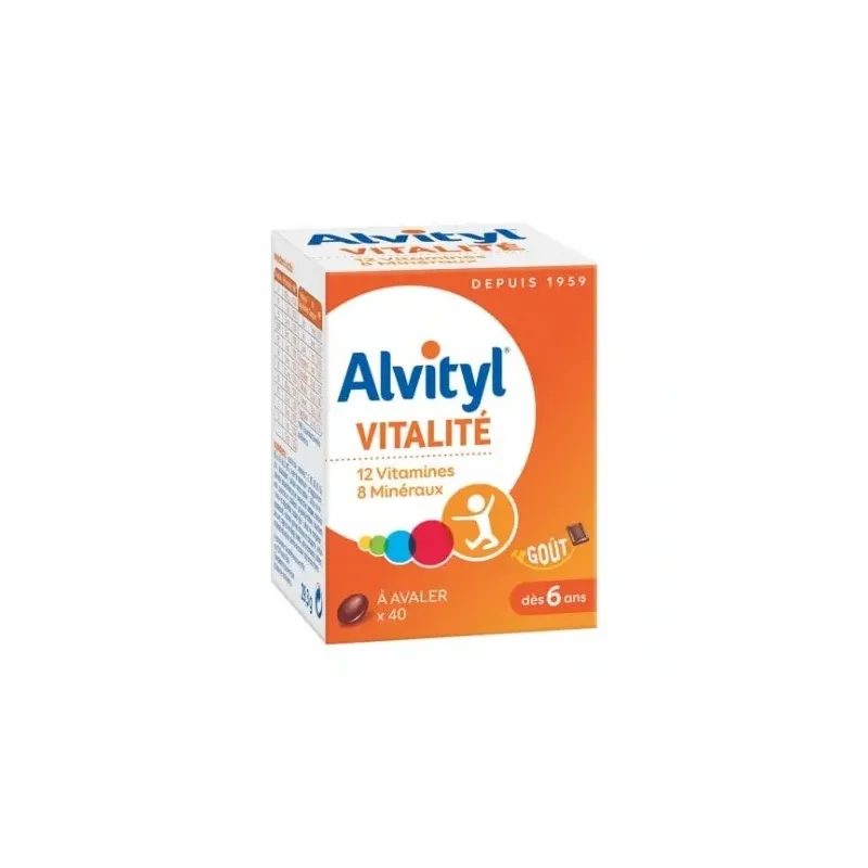 Alvityl Vitalité 40 Comprimés est un complexe de 12 vitamines et 8 minéraux à avaler, conçu pour soutenir la vitalité physique et mentale et renforcer l'immunité, adapté aux enfants (dès 6 ans), adolescents et adultes.