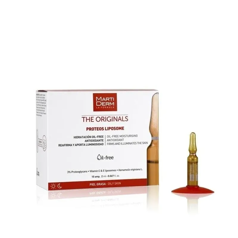 Ampoules MARTIDERM The Originals Proteos Liposome sont un soin de jour et/ou de nuit spécifiquement formulé pour les peaux grasses, réactives et sensibles. Elles offrent une hydratation intense, une protection antioxydante, et aident à réguler le sébum sans alourdir la peau. La particularité de ces ampoules est d'utiliser des Protéoglycanes encapsulés dans des liposomes, ce qui garantit une meilleure pénétration des actifs et une formule oil-free (sans huile), idéale pour les peaux grasses et acnéiques qui ne tolèrent pas les formules riches.