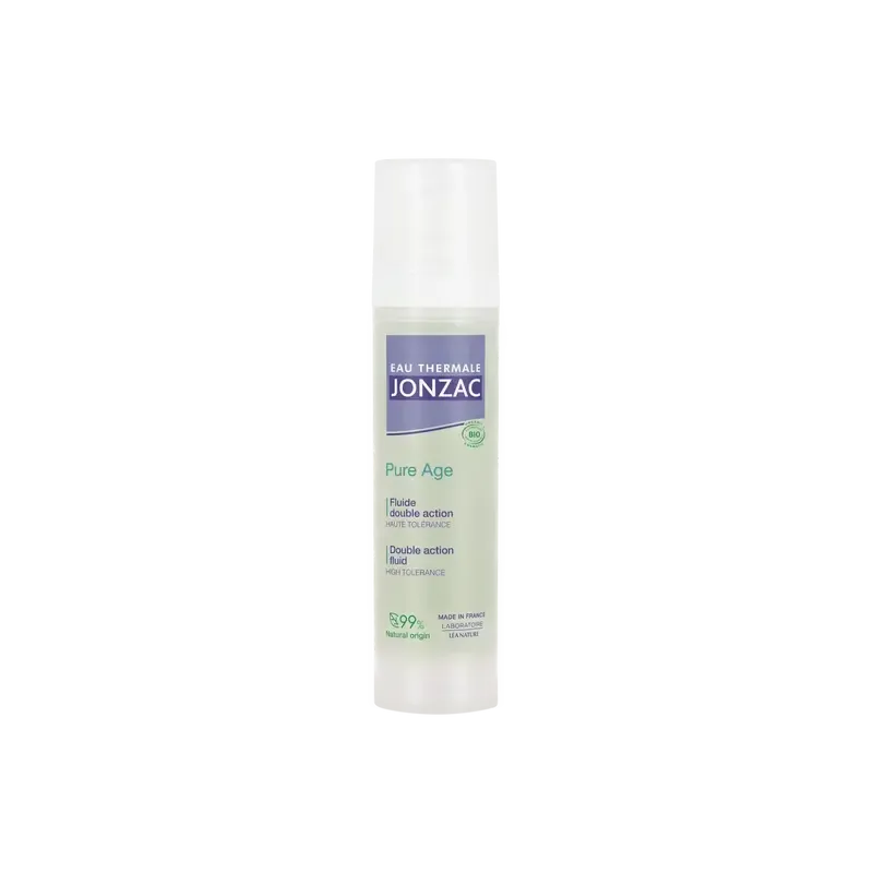 Le Jonzac Pure Age Fluide Double Action 40ml est un soin bio tout-en-un pour les peaux adultes à imperfections et sensibles, agissant sur les signes de l'âge. Il réduit les imperfections, floute les pores, et lisse rides et ridules grâce à l'Eau Thermale de Jonzac, au Zinc PCA et à l'Acide Hyaluronique. Sa texture légère matifie et unifie le teint, pour une peau purifiée et rajeunie.